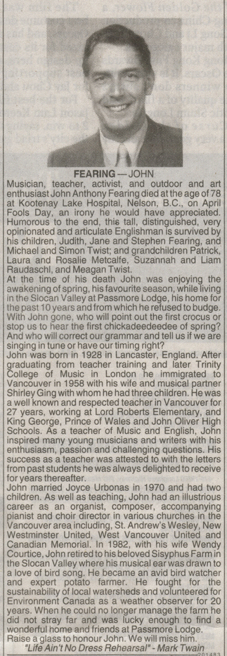 I was saddened to learn of the death on April 1, 2007 of John Fearing ("Mr. Fearing" to me), a great man, who, as teacher, musician and father figure, has been a major influence in my life, even though I only encountered him twice, and briefly, since finishing high school in 1969. I have only vague memories of music in school until I moved to Vancouver in fourth grade. In Lord Roberts Elementary School, music was actually a "subject." Mr. Fearing, the music teacher, taught us to play the recorder and to count by saying "ta, ta, ta-te ta, ta-te, ta-te, ta-a-a-a". I don't think I will ever forget "Little John," the recorder tune he made us memorize. Mr. Fearing left Lord Roberts to upgrade his qualifications, so we had someone else for music while I was in grade 7. Then I hit Grade 8, in 1964, and there he was, teaching band, music and English in my high school! I took those subjects from him for the next five years. King George Secondary School was the second smallest school in the city, with only around 420 kids and 21 or 22 teachers. Since there weren't enough band students to fill a band class in the normal school schedule, we always played in the morning (7:45) and at lunch (12:15 to 1:00). Mr. Fearing encouraged us to play in small groups, taking us around the city to perform in churches such as Ryerson and West Vancouver United Churches, where he was the organist. He also took the entire band to his summer home on Thormanby Island, off the Sunshine Coast. I recall it being an A-frame structure, with a granite bluff for a front yard. Mr. Fearing's love was early Western music, that of the mediaeval, renaissance and baroque eras (oh, yes, we played a lot of renaissance music). He enjoyed harpsichords, and took us to see the S. Sabathil & Son Ltd. harpsichord factory in Vancouver (it's now on Bowen Island). We kids put thumbtacks on all the felt hammers of his school piano to make it sound more like a harpsichord, and I think he kept it that way for the rest of my years at King George. Mr. Fearing's terraced bandroom was beside the main entrance, with practice rooms at the top, and a chalkboard at the lower end. Rather than seating the band on the terraces, we sat on the top level which was big enough to accommodate the whole band in, if I recall, three rows. The terraces were for the desks, and the room resembled a lecture hall with the piano, stereo and teacher's desk at the bottom. There were also a few practice rooms at the top, big enough for a quartet, with large glass windows that probably were intended to ensure there was no mischief. Down at the bottom, behind the chalkboard, was a long, narrow instrument storage room. There were entrances at the top and bottom of the room. Kids sneaking in the upper door when he was teaching below would often hear a booming "Put the wood in the hole!" In Music Appreciation class we listened to everything in the "serious" categories from early music recorded by English ensembles to Stravinsky to John Cage. The classes were long enough to hear a whole LP record, and I enjoyed listening to the classroom stereo very much. I bought my first record, Tchaikovsky's Romeo and Juliet, because I liked the art work on the album cover he passed around while we were listening to the recording. I remember also listening for class after class to Benjamin Britten's long, long War Requiem. I don't know if that was in English class or Music Appreciation, but it's fair to say we heard a lot of it... How fitting it seems that Mr. Fearing died on April 1. I have two enduring April Fool's Day memories of him. One April 1st, probably when I was in Grade 9 or 10, five or six of us lifted his Volkswagen, a real Beetle with handles on its bumpers, over to the entrance to the teachers' parking lot, and placed it across the entrance - almost a perfect fit. He wasn't happy about that, but it was fair, I think, since it was the natural outcome of my other memory of that day. He had just played an April Fool's prank on us - he gave us this incredibly hard surprise music appreciation exam, collected all the papers in, and threw them in the trash, saying "April Fool!" Mr. Fearing taught us to think critically. He expected more than just ordinary schoolwork. Our English course included an assignment to watch the controversial CBC television show "This Hour Has Seven Days" every week, even though it aired at 10 p.m. Sundays. I played clarinet in the school band, until Mr. Fearing let me play the bass clarinet. The bass clarinet was my principal instrument for most of high school, although I also played tenor sax a little, too (he abhorred saxophones). School band was fun. Not only did we have this "stern disciplinarian" with a sense of humour leading us, but other teachers joined the band. Among them were Henry Penner (tuba), Bob Emmott (trombone), Gareth Prytherch (clarinet)and, later, I believe Stan Carr (sax) and possibly Mrs. (Mavis?) Kent on clarinet. I was not a particularly good student, but I enjoyed school, for which I thank Mr. Fearing and his fellow teachers, and in particular the staff members who were part of our band. While the photograph to the left on his obituary is a good one, the two at the bottom of this page, are the man I remember. I don't know if Mr. Fearing realized the impact he had on my friends and me, a bunch of kids from single-parent families. We hung out together, music and our paper routes being the glue that kept us together. This could not have happened without John Fearing's support and encouragement. We still talk about him when we get together. I know my mother phoned him more than once to get advice on how to raise a teenager, which is ironic considering he was only a young man himself at the time. I don't think I would be playing music today if it weren't for John Fearing. I will always remember him, and be grateful for what he taught me. |