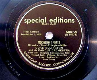 | Moonlight Fiesta Special Editions 5007-S American Record Corporation Matrix: B16974-1 Duke Ellington and His Famous Orchestra New Desor DE3502b Recorded March 5, 1935, ARC recording session, New York, NY Steven Lasker writes in DEMS Bulletin DEMS 10/3-10: "This Ellington disc was released in 1948,...These discs were aimed at the collector's market, and were sold at a premium price. The series was produced by George Avakian, ..."American Record Corporation," which is printed on the labels, is a bit of an anachronism, as the name had more or less been phased out by "Columbia Recording Corporation" (from 1939) and then "Columbia Records" (from 1946)." DEMS then quotes from page 21 of "The Billboard" (Billboard magazine), 8 May 1948, which can be viewed with GoogleBooks. Col'bia Aims For Collectors' Market Biz Revives American Catalog information updated 2011-06-25 |