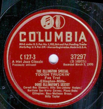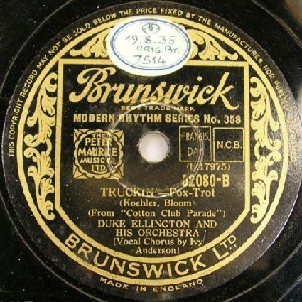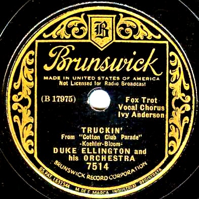 | Truckin' Brunswick 7514 Brunswick Record Corporation Matrix: B17975-1 Duke Ellington and His Orchestra voc. Ivy Anderson New Desor DE3504b Recorded Aug 19, 1935 ARC sesson, NYC Listen on http://www.jazz-on-line.com, (courtesy of Michel Essevaz-Roulet) |