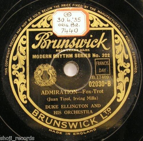 Brunswick (England) 02030-B Brunswick Ltd. (Modern Rhythm Series No. 322) Matrix B 17409-1 Duke Ellington and His Orchestra New Desor DE3053d Recorded April 30, 1935 ARC session, New York City Listen on The Red Hot Jazz Archive Image courtesy of The Dooji Collection added 2011-06-29 |