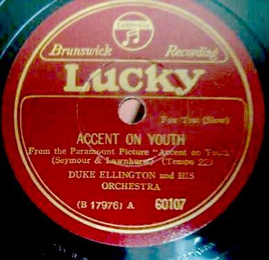 | Accent on Youth Brunswick 7514 Brunswick Record Corporation Matrix B17976-1 Duke Ellington and His Orchestra New Desor DE3504c Recorded Aug 19, 1935 ARC sesson, NYC Listen on http://www.jazz-on-line.com, (courtesy of Michel Essevaz-Roulet) upgraded 2010-03-07 |