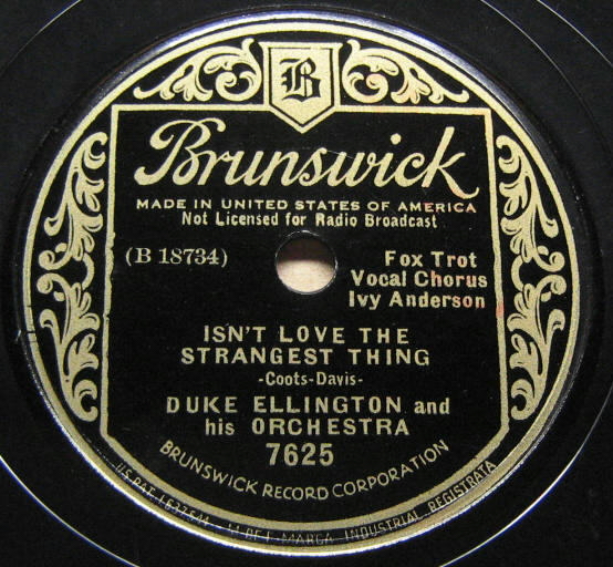 | Isn't Love the Strangest Thing? Brunswick 7625 Brunswick Record Corporation Matrix B18744-1 Duke Ellington and His Orchestra (Ivy Anderson, voc.) New Desor DE3604a Recorded Feb 27 1936 ARC session, NYC Listen on http://www.jazz-on-line.com, (courtesy of Michel Essevaz-Roulet) added 2007-12-07 |