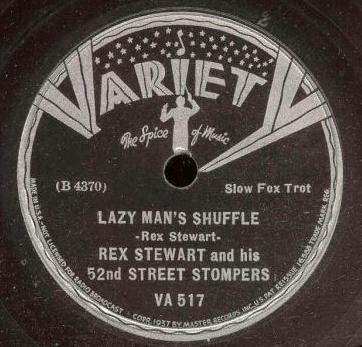 | Lazy Man's Shuffle Variety VA 517 Matrix B4370-B Rex Stewart and his 52nd Street Stompers New Desor DE3610d Recorded Dec. 16,1936 at Master recording session, Los Angeles, Ca. (see the history of the Master and Variety labels at http://www.iajrc.org/variety.htm) |