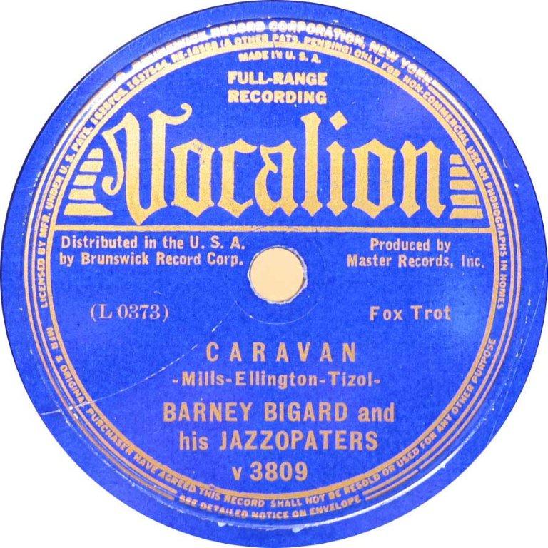 | Caravan Vocalion v 3809 Master Records, Inc. Matrix L0373-1 Barney Bigard and His Jazzopaters New Desor DE3611e Recorded Dec 19,1936 Master recording session, Los Angeles Listen on Red Hot Jazz Added 2010-08-24 |