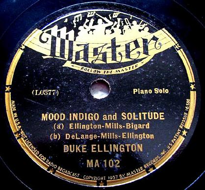 | Mood Indigo and Solitude Master MA 102 Master Records, Inc. Matrix L0-377-1 New Desor DE3612c,d &e (c and e are Mood Indigo, d is Solitude) Duke Ellington, piano Recorded Dec 19, 1936 Master session, Los Angeles Listen on http://www.jazz-on-line.com, (courtesy of Michel Essevaz-Roulet) upgraded 2010-04-11 |
