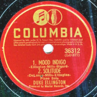 | Mood Indigo and Solitude Columbia 36312 Master Records, Inc. Matrix L0-377-1 New Desor DE3612c,d &e (c and e are Mood Indigo, d is Solitude) Duke Ellington, piano Recorded Dec 19, 1936 Master session, Los Angeles Listen on http://www.jazz-on-line.com, (courtesy of Michel Essevaz-Roulet) added 2009-05-09 |