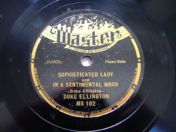 | Sophisticated Lady and In a Sentimental Mood Master MA 102 Master Records, Inc. Matrix L0-378-1 Duke Ellington, piano New Desor DE3612f &g (f is SLady, G is IASM) New Desor DE3612f (I.A.S.M.) and g (S.L.) Recorded Dec 21, 1936 Master session, Los Angeles Listen on http://www.jazz-on-line.com, (courtesy of Michel Essevaz-Roulet) added 2007-09-03 |